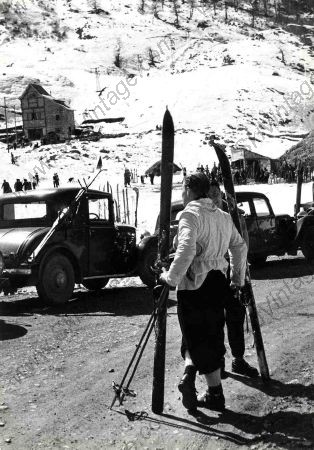 Les débuts du ski à Gourette... Skieurs et voitures traction au rendez-vous - Photo originale Kama (1936)